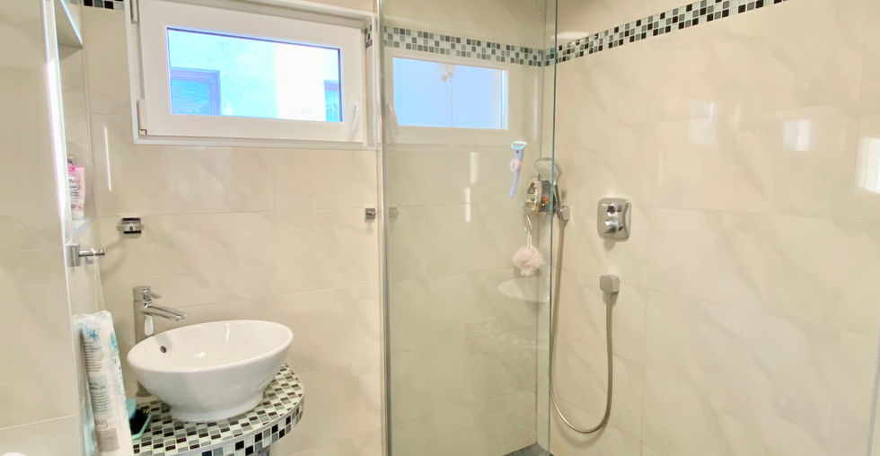 Das moderne Badezimmer mit Fenster und Dusche sorgt für eine angenehme Wohlfühlatmosphäre. Der Einsatz von Fliesen und Laminat verleiht der Wohnung einen zeitgemäßen und einladenden Charakter. Die Elektroinstallation und der Heizofen sorgen zudem für wohlige Wärme in der kalten Jahreszeit.